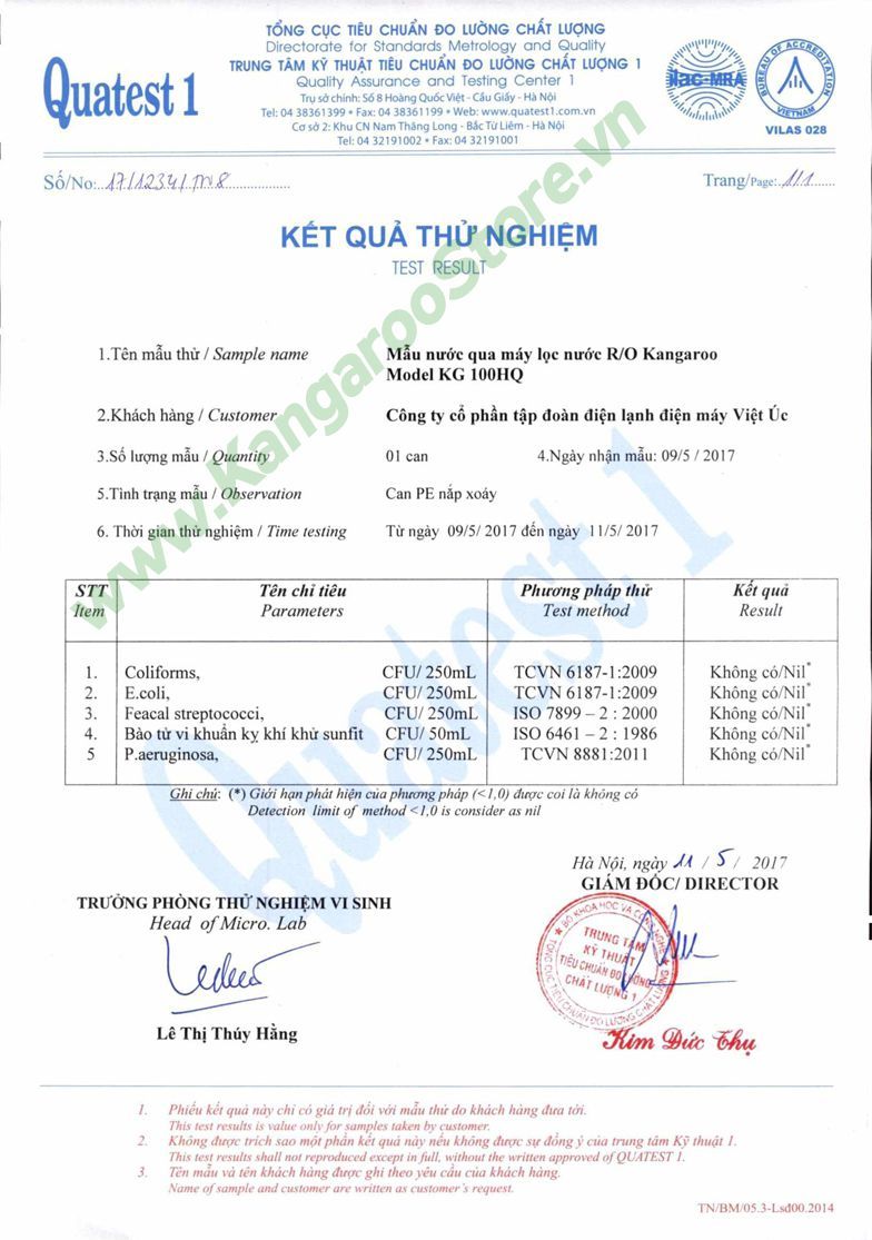 GIẤY CHỨNG NHẬN NƯỚC SAU LỌC